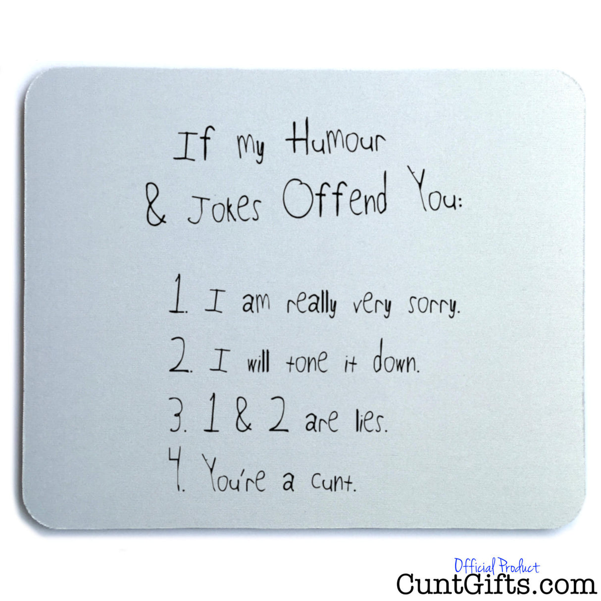 Also available as a mug, keyring, card, and badge. View the full “If My Humour Offends You” collection or browse the complete mouse mat range.